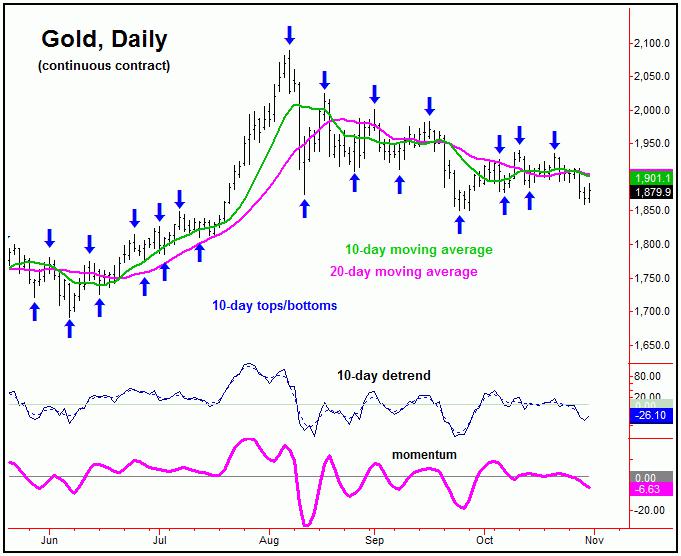 With the action seen in recent days, the downward phase of the 10-day cycle was confirmed to be back in force, and noted market report. As mentioned above, this wave is at or into bottoming territory - and with that is looking for a quick rally in the coming days, with the 10 and 20-day moving averages acting as normal price magnets.