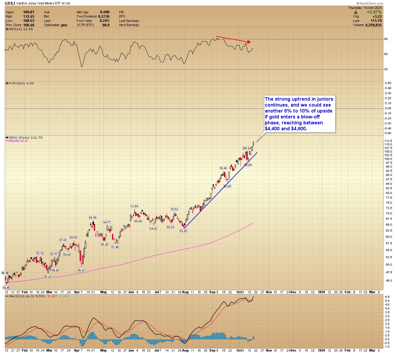 GDXJ: The strong uptrend in juniors continues, and we could see another 5% to 10% of upside if gold enters a blow-off phase, reaching between $4,400 and $4,600.