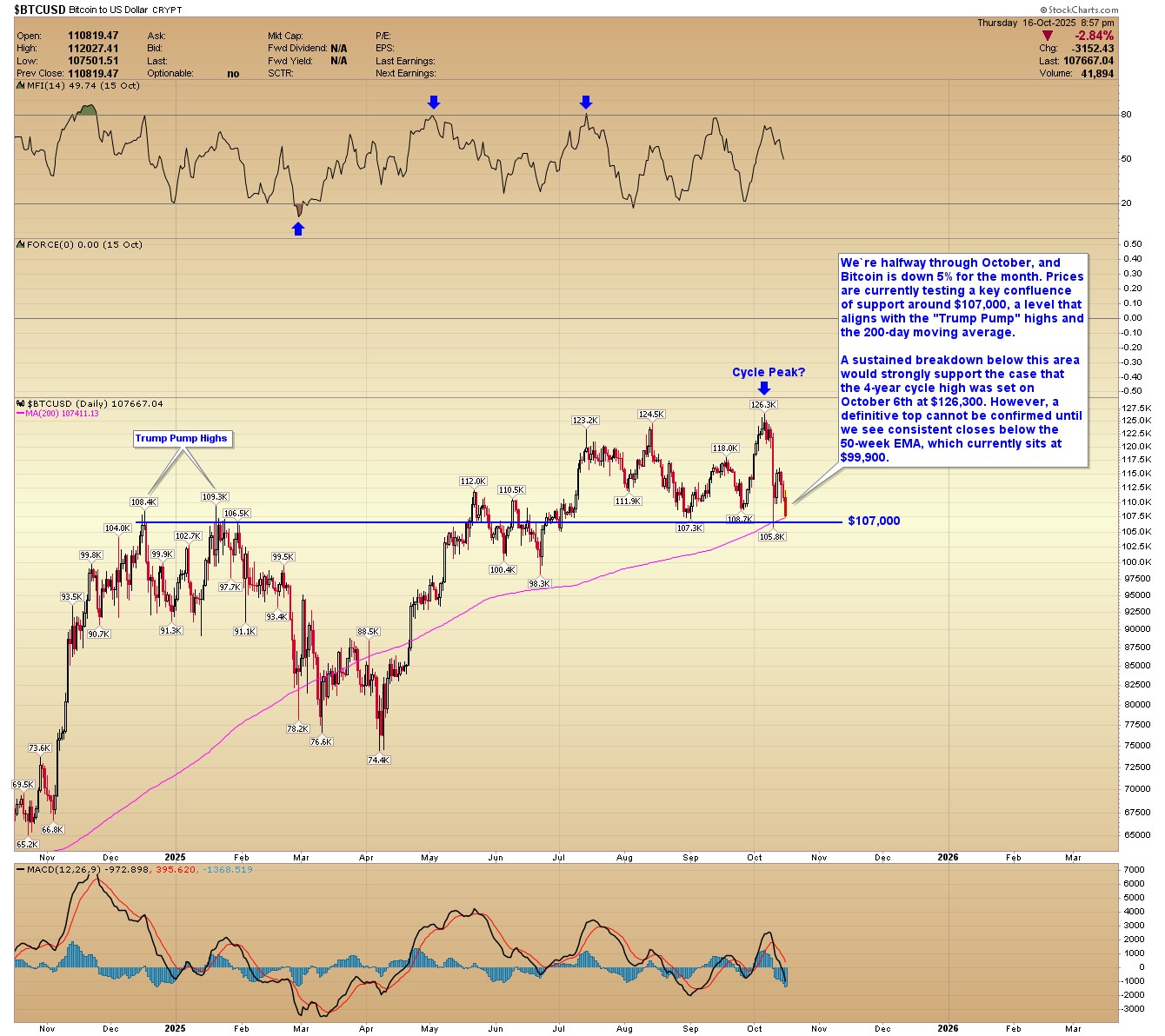 BITCOIN: We're halfway through October, and Bitcoin is down 5% for the month. Prices are currently testing a key confluence of support around $107,000, a level that aligns with the "Trump Pump" highs and the 200-day moving average.