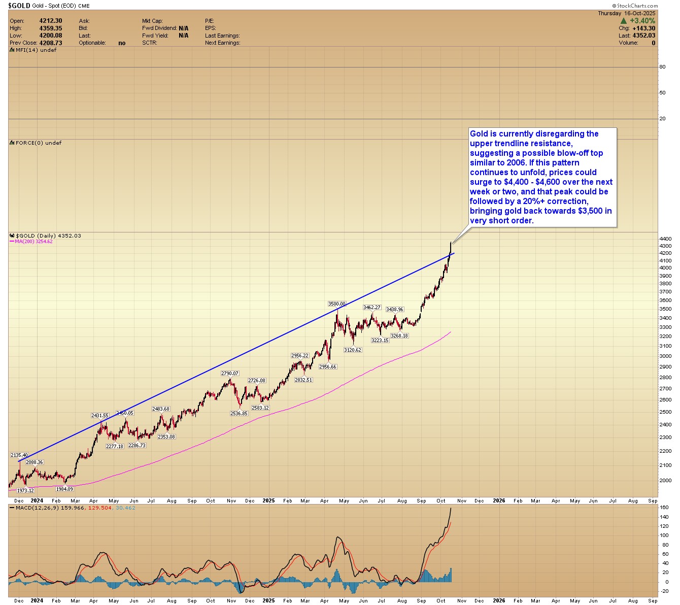 GOLD: Gold is currently disregarding the upper trendline resistance, suggesting a possible blow-off top similar to 2006. If this pattern continues to unfold, prices could surge to $4,400 - $4,600 over the next week or two, and that peak could be followed by a 20%+ correction, bringing gold back towards $3,500 in very short order.