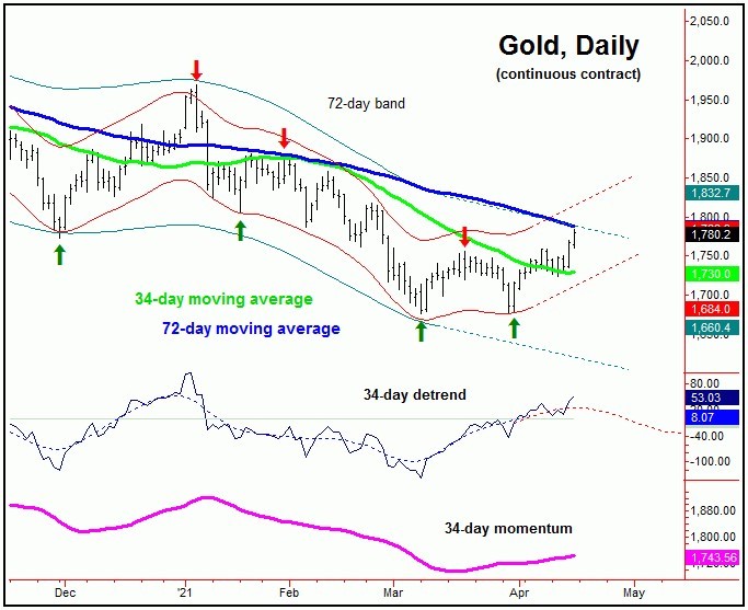 This did end up as the case, with the metal bottoming with last Tuesday's tag of the 1723 figure - and, with the following action, we were able to confirm the next upward phase of this 10-day wave to be back in force. This was suggested to be the real 'breakout' point to the upside for gold, due to the position of the larger 34 and 72-day cycles. Shown below is the smaller 34-day component: