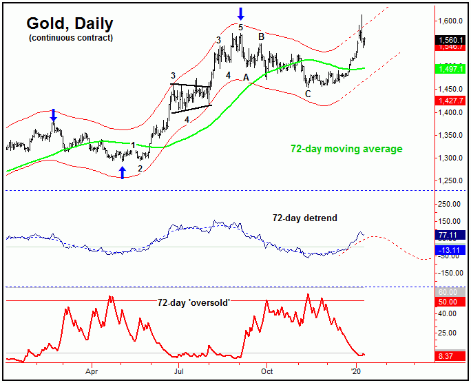 Stepping back, the next peak of importance has been expected to come from the 72-day cycle, with this wave last bottoming back in December - and confirmed with the following reversal above the 1490.00 figure (February, 2020 contract). Since that reversal, the metal has risen over $123 into its most recent high. In terms of time, the rally phase of this wave has been projected to hold up into the mid-January timeframe or later. Here again is our 72-day wave:
