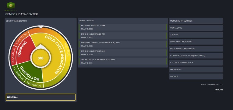 Our Gold Cycle Indicator is at 318. Once it enters the red topping zone, we will start looking for a top.