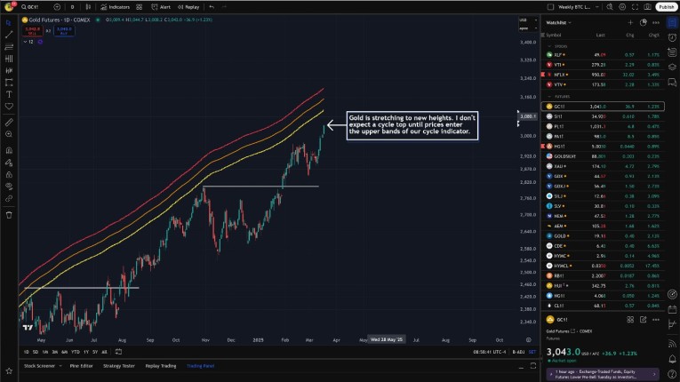Gold is stretching to new heights. I don't expect a cycle top until prices enter the upper bands of our cycle indicator.