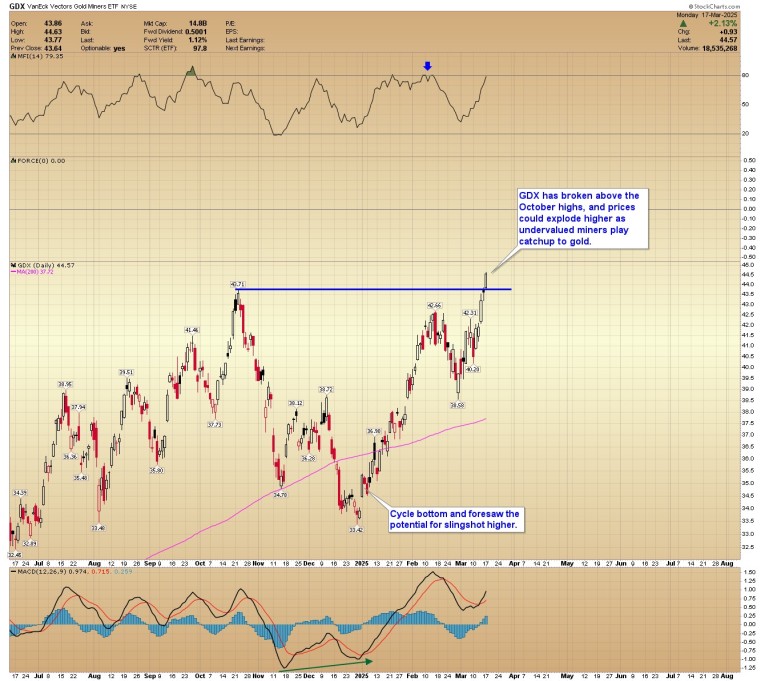 GDX has broken above the October highs, and prices could explode higher as undervalued miners play catchup to gold.
