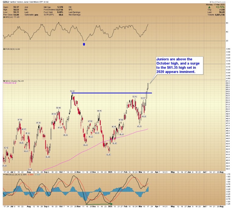 Juniors are above the October high, and a surge to the $61.35 high set in 2020 appears imminent.