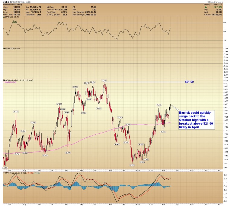 Barrick could quickly surge back to the October high with a breakout above $21.00 likely in April.