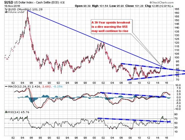 HOWEVER, once the bottom is established, the price of gold will indubitably soar to new all-time highs in 2017 and years beyond…as the US stock market plunges into a long overdue Bear Market. Moreover, the unprecedented 34 year bond bull market appears to be faltering…and may also plunge to begin a very long overdue BEAR MARKET TREND. Consequently and indubitably, panicked bond investors worldwide will flee to the historical safe-haven of gold.