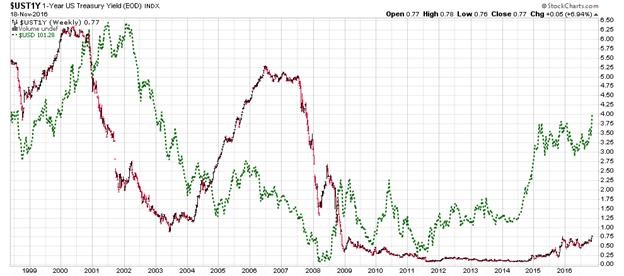 Clearly, the US Dollar Index runs overall and in approximate tandem with the US 1-Year Treasury Yield.