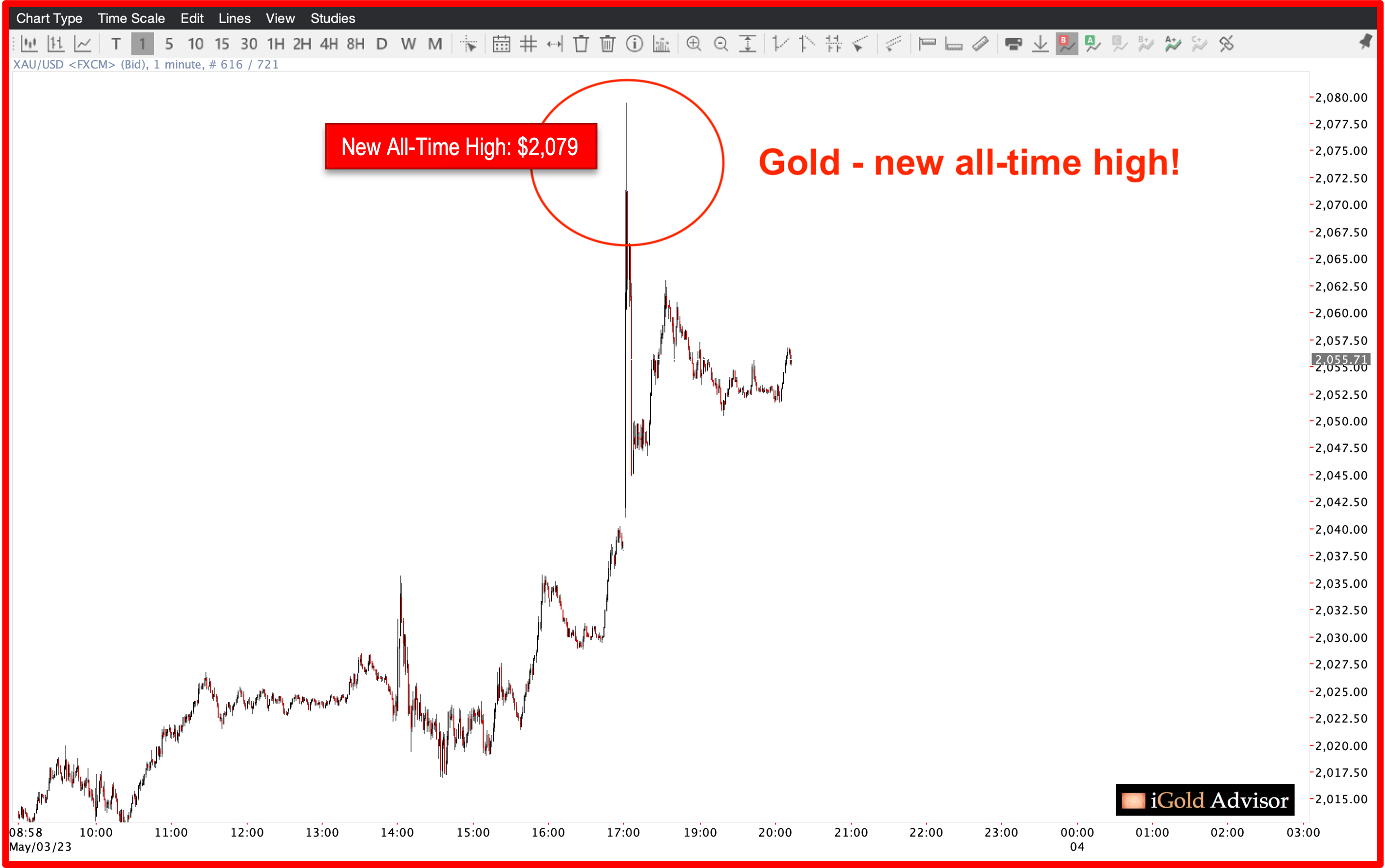 Although gold has thus far not closed above the former $2,074 all-time high, it has indeed registered a new record price intraday.