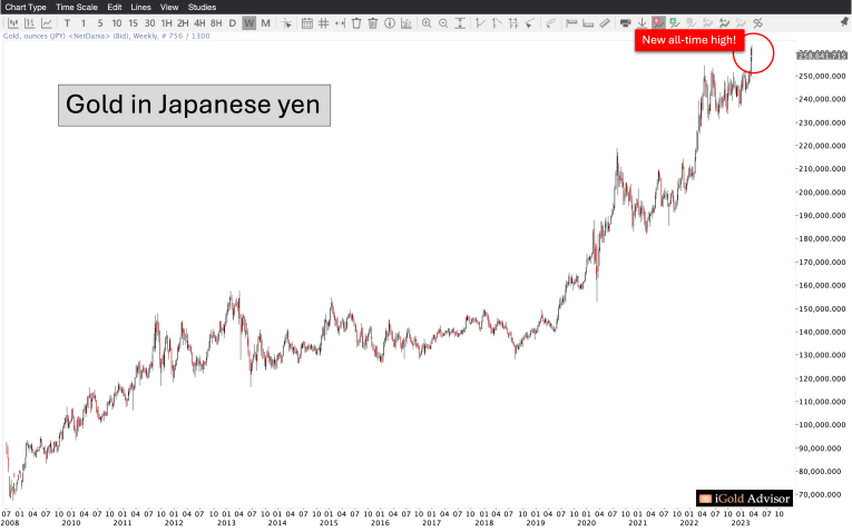 First, gold as priced in the Japanese currency has just broken out to a new all-time high, eclipsing the former peak of 255,000 yen per ounce set in 2022. As this is being written, gold is trading at 258,000. We now have an official target of 278,000 yen for gold in the Japanese currency.
