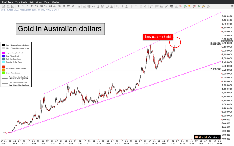 Second, gold as priced in Australian dollars has just broken out to a new all-time high, eclipsing the former peak of $2,873 set in 2020. As this is being written, gold is trading at $2,964. We now have an official target of $3,560 for gold in the Australian currency.
