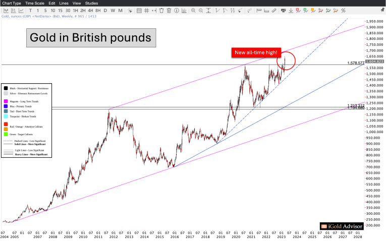 Third, gold as priced in British pounds has just broken out to a new all-time high, eclipsing the former peak of 1,578 pounds set in 2020. As this is being written, gold is trading at 1,631 pounds. We now have an official target of 1,960 pounds for gold in the British currency.