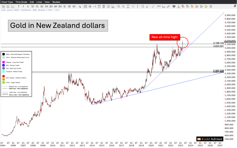 Fourth, gold as priced in New Zealand dollars has just broken out to a new all-time high, eclipsing the former peak of $3,108 set in 2020. As this is being written, gold is trading at $3,156. We now have an official target of $3,895 for gold in the New Zealand currency.