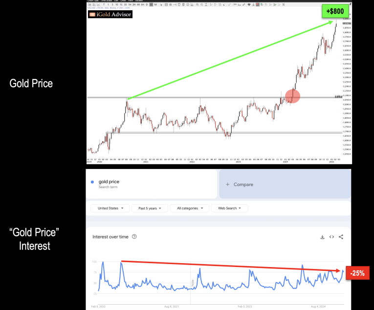 Note how gold consolidated from 2020 – 2024 between $1,680 - $2,075 per ounce, before finally breaking out in March 2024 (red highlight).