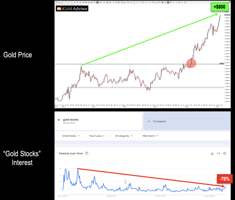 Again, note the divergence between the gold price, which has risen $800 or 40% since 2020, and interest in gold stocks, which has collapsed by 70% over the same period.