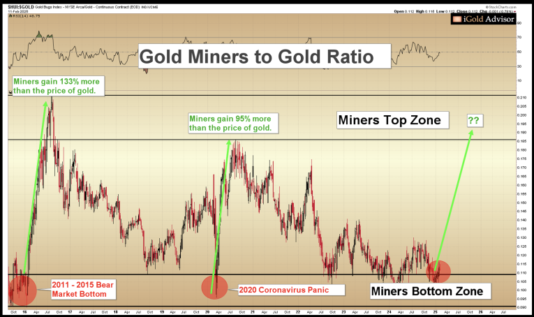 Note that the previous two times that this ratio bottomed (Miners Bottom Zone), in 2015 and 2020, gold stocks outperformed the gold price itself by 133% and 95%, respectively.