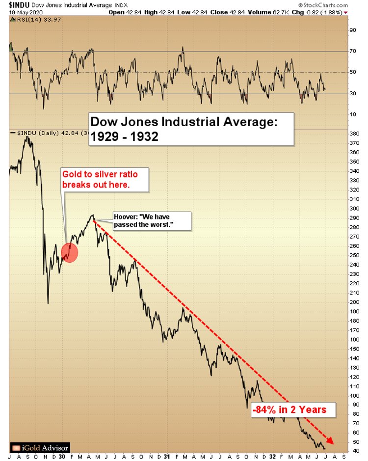 The same signal which last appeared in early 1930 at the start of the Great Depression has just appeared again – the gold to silver ratio has, in March 2020, broken out to a new all-time high. To review the chart from the first page again: