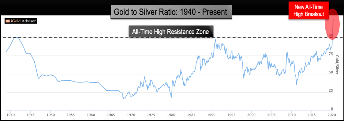 The gold to silver ratio – it has just shattered its former all-time highs.