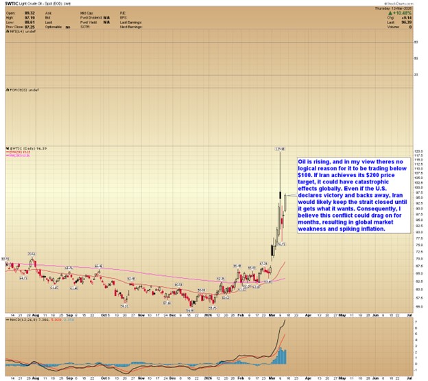 Oil is rising, and in my view there’s no logical reason for it to be trading below $100. If Iran achieves its $200 price target, it could have catastrophic effects globally. Even if the U.S. declares victory and backs away, Iran would likely keep the strait closed until it gets what it wants. Consequently, I believe this conflict could drag on for months, resulting in global market weakness and spiking inflation.
