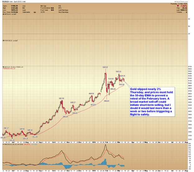 Gold slipped nearly 2% Thursday, and prices must hold the 50-day EMA to prevent a retest of the February lows. A broad market sell-off could initiate short-term selling, but I doubt it would last more than a week or two before triggering a flight to safety.