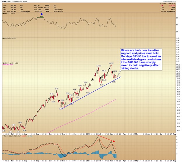 Miners are back near trendline support, and prices must hold Monday’s $95.96 low to avoid an intermediate-degree breakdown. If the S&P 500 turns sharply lower, it could negatively affect mining stocks.