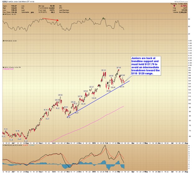 Juniors are back at trendline support and must hold $127.79 to avoid an intermediate breakdown toward the $110–$120 range.