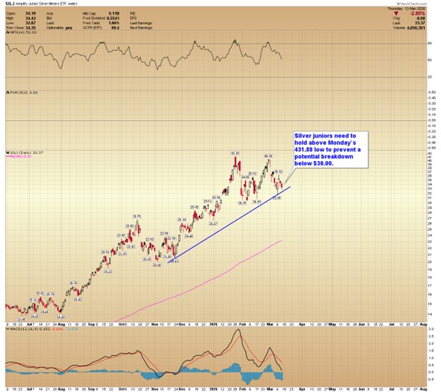 Silver juniors need to hold above Monday's 431.88 low to prevent a potential breakdown below $30.00.