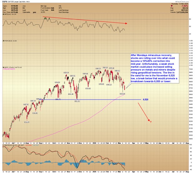After Monday’s miraculous recovery, stocks are rolling over into what could become a 10%–20% correction into mid-year. Unfortunately, a weak stock market could place increased selling pressure on metals and miners despite rising geopolitical tensions. The line in the sand for me is the November 6,520 low; a break below that would promote a breakdown towards 6,000 or lower.