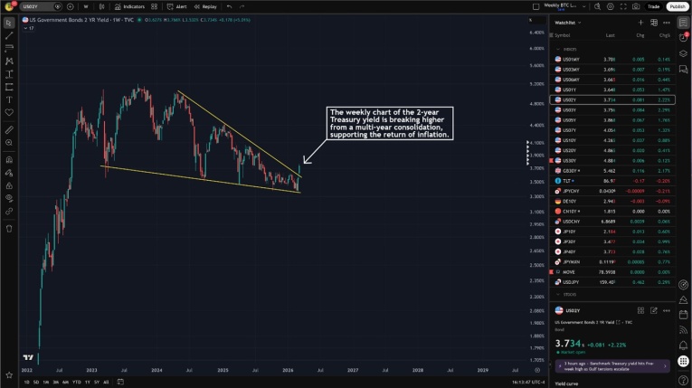 The weekly chart of the 2-year Treasury yield is breaking higher from a multi-year consolidation, supporting the return of inflation.