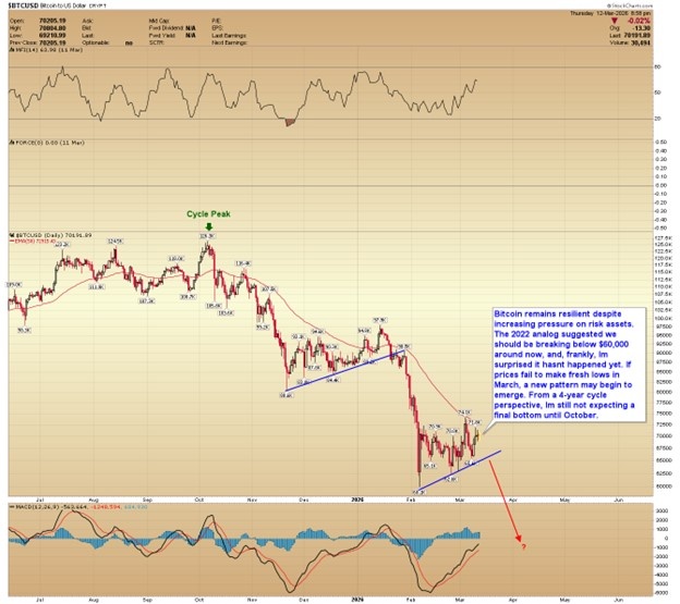 Bitcoin remains resilient despite increasing pressure on risk assets. The 2022 analog suggested we should be breaking below $60,000 around now, and, frankly, I’m surprised it hasn’t happened yet. If prices fail to make fresh lows in March, a new pattern may begin to emerge. From a 4-year cycle perspective, I’m still not expecting a final bottom until October.