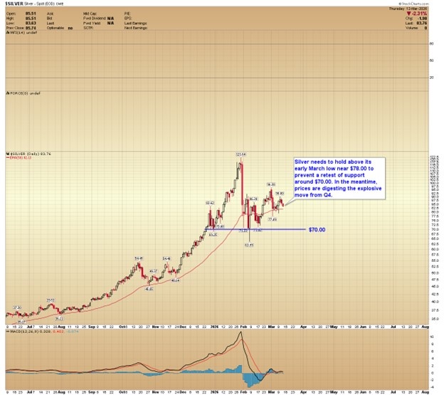 Silver needs to hold above its early March low near $78.00 to prevent a retest of support around $70.00. In the meantime, prices are digesting the explosive move from Q4.