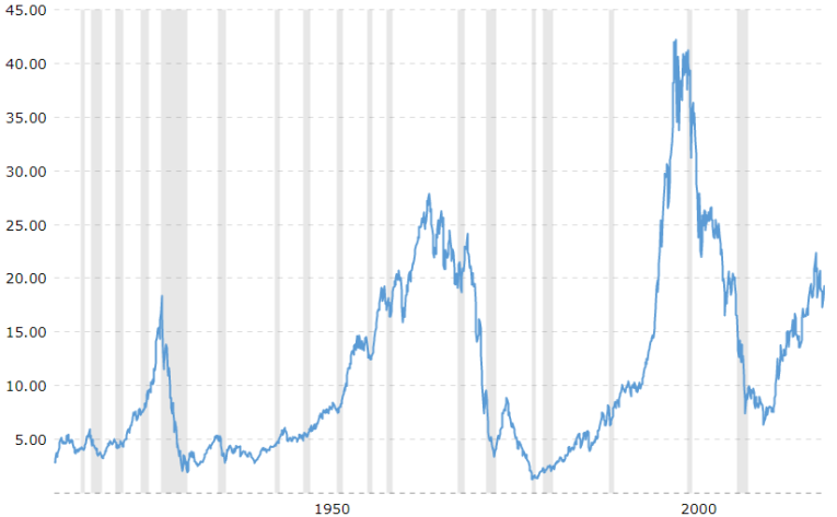 Right now, the ratio is over 19. In other words, the ratio is a bit higher now than it was in 1929, but not as high as it was in 1966 or 1999.