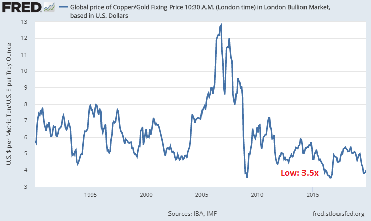 Also of note is the fact that this ratio tends to have somewhat consistent three-year cycles. The ratio bottomed in 1993, 1996, 1999, and 2002. During the generational China-driven copper boom, it didn’t bottom for several years until bottoming again in early 2009. Then it bottomed again in late 2011 (just under 3 years), and again in 2016 (more like 5 years), and appears to potentially have bottomed in 2019 (3 years again, if the bottom is in).