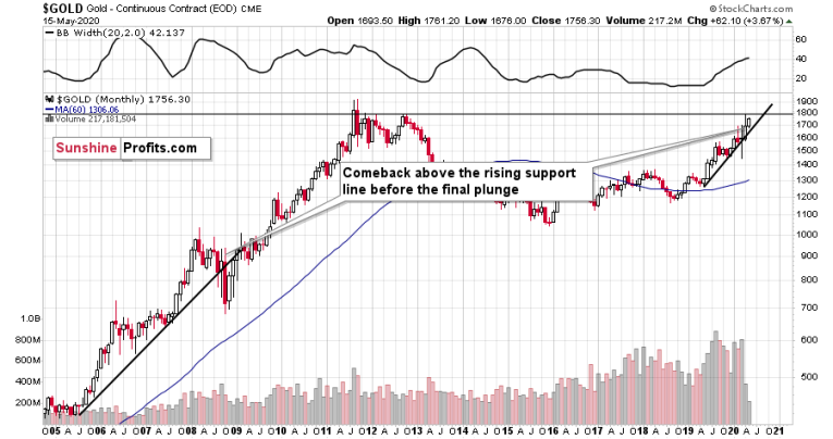 In 2008, after the initial plunge, and a – failed – intramonth attempt to move below the rising support line, gold came back above it and it closed the month there. The same happened in March 2020.