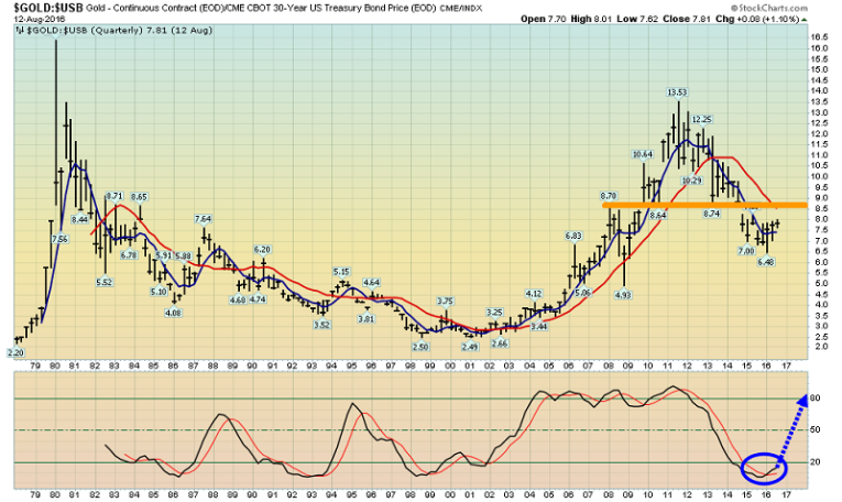 This is the important gold versus T-bonds quarterly bars chart. A rise in real interest rates can cause money managers to book profits in the gold market.