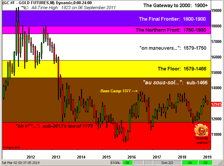 Finally we turn to Gold's broad structure by the monthly bars since 2011's All-Time High at 1923, a level which we firmly say (by some conservatively so) shall be revisited. We don't expect such to occur this year, but when it comes, it could well so do quite swiftly. Remember: the trading activity from the 1600s down through the 1400s was comparatively sparse; not a pure "gap" mind you, but forget-thee-not the trader's axiom that "All gaps get filled". Technically we've Gold now having entered a healthy corrective mode. And fundamentally we've so many Gold positives they could fill (and have filled many) a book. Here's the Structure:
