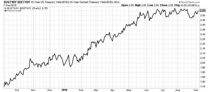 Over the past year, the yield gap has widened in favor of the dollar until June when the trend has stalled, reflecting a 50% cut in bond purchases by the European Central Bank and an expectation that ECB buying will come to an end this December. If true, EU debt will fall (yields will rise) as the biggest and least price-sensitive purchaser stops bidding. We expect the yield gap will likely close.