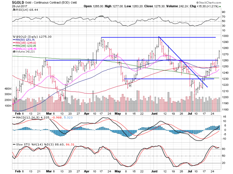 Gold prices gained 1.63% this past week as it moved above the moving average cluster at $1,250. We’re now free to move to $1,300 where resistance is likely.