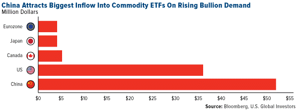 - As you can see in the chart below, China attracted $52 million into commodity-linked ETFs over the past week. A weakening yuan and capital outflows from the Asian nation are adding to the global forces helping to boost demand for gold, reports Bloomberg. Investors are seeing an alternative after the yuan sustained its worst annual loss against the dollar in more than two decades, the article continues.