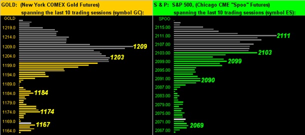 My take is that Gold applies the brake whilst the S&P doth downhill ski. Either way, both markets' trading profiles now have built in arduous swaths of near-term overhead trading resistance. Again below, with Gold on the left and the S&P on the right, the white bars in both panels are Friday's settles. Seems like the prices of the two markets ought be reversed, what? ('Tis just a matter of time...):