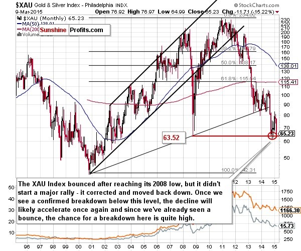 The XAU Index (that includes both gold stocks and silver stocks) is already extremely close to its 2008 and 2014 lows. Only a little more weakness is needed for this index to break below these lows and to move even lower. The next major support is very low – close to the 42 level – so there will be significant downside if the breakdown is confirmed. It will be critical to watch the situation develop in the upcoming weeks and react to breakdowns and their confirmations.