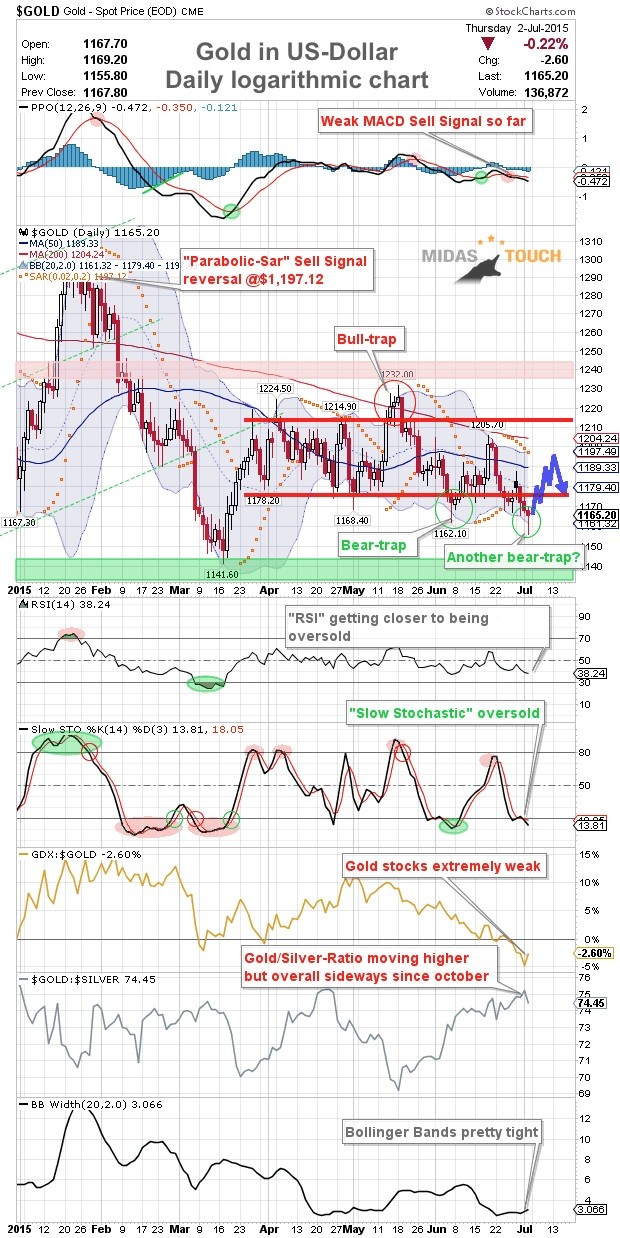 Two weeks ago I expected only a minor setback in Gold. That was obviously wrong. Gold came all the way down to US$1,155.80 during last Thursday. But at least we saw a bounce from the lows which left a bull-hammer on the chart. With the Greeks clearly rejecting the bailout conditions, the next couple of days should be volatile and Gold´s gap up could hold this time.