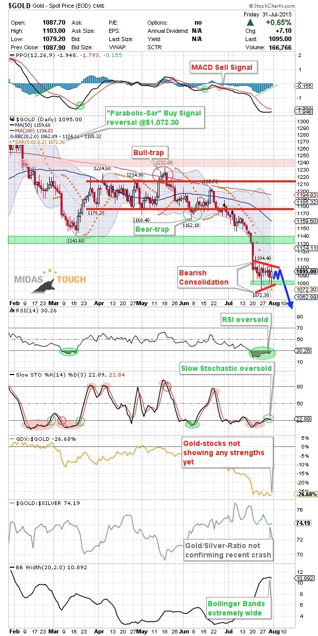 After crashing through US$1,130 Gold has spend the last two weeks consolidating between US$1,080 and US$1,106. It looks like this might continue for some more days or even weeks. Overall this price action is bearish and should ultimately lead to lower prices. Once US$1,080 is clearly broken everything could happen very fast. While the MACD sell signal from end of June is still active, the RSI as well as the Slow Stochastic are moving up from extreme oversold levels. Therefore we probably should have some more time before the crash continues. Should this long expected sell-off down towards $1,035 really happen I am looking for some positive divergences in these indicators which would confirm that this indeed is the final wave of the 4 year bear market. Is there a chance for an immediate recovery and a rally towards US$1,125-US$1,140? Yes, but I´d rate it a very low probability especially as long as Gold is trading below $1,106 and below US$1,115. Once the final down wave hits the market it will present an epochal opportunity.