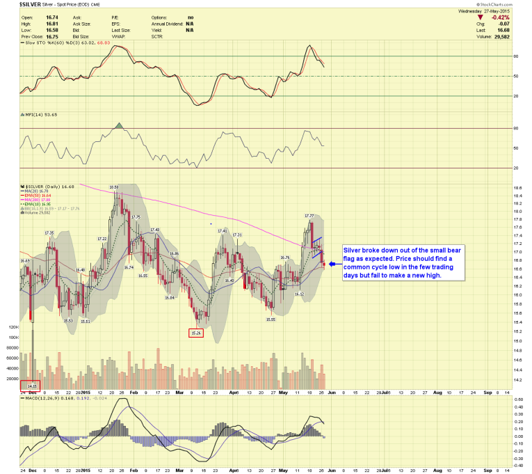 Price broke lower out of the small bear flag as expected, and we should get a common cycle low soon, it too will fail to make a higher high before rolling over.