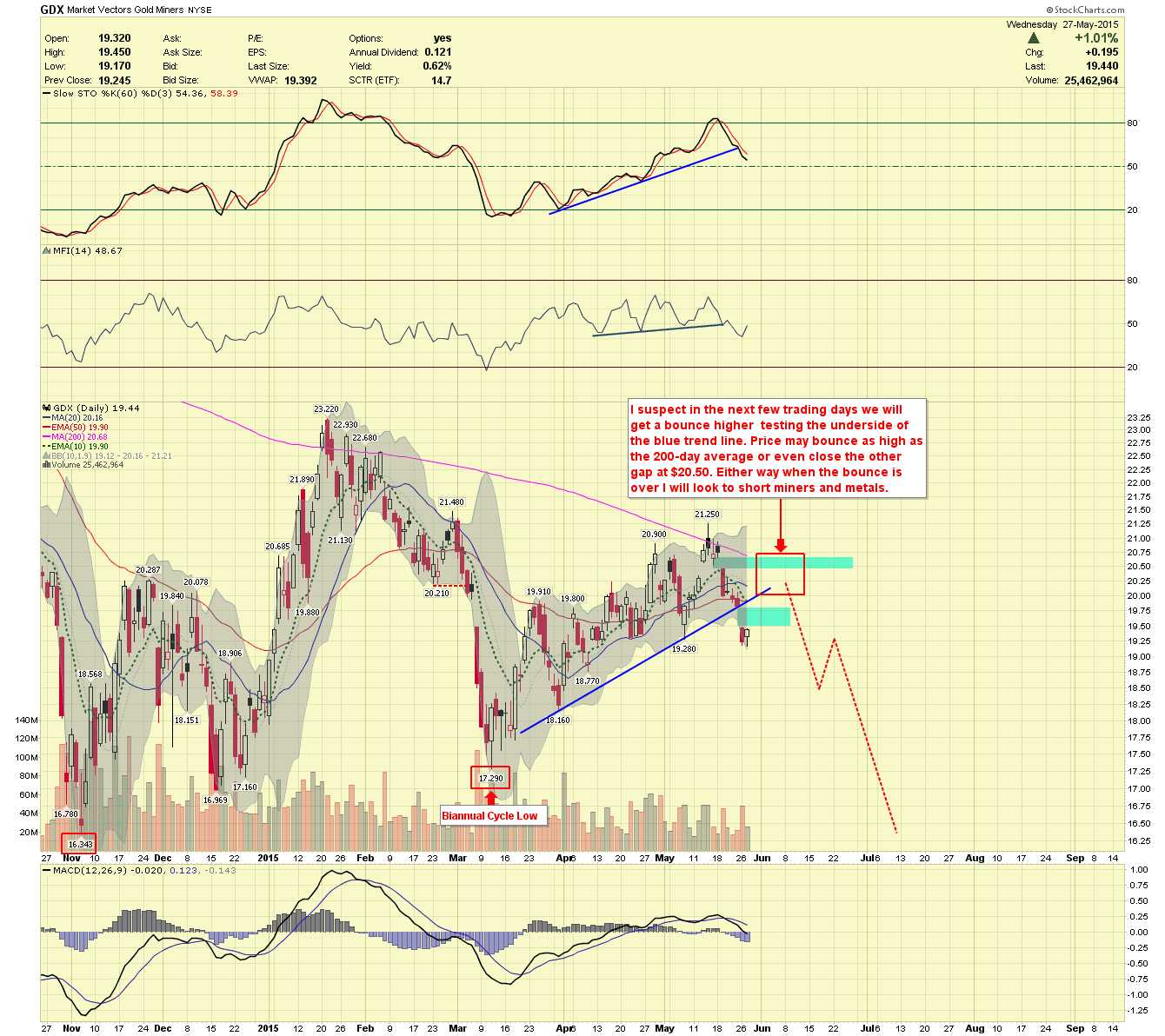 Price gapped down through trend line in a very bearish manner. We will likely get a bounce whenever that will close the gap and test the underside of the blue trend line. A false rally may even take the price to the 200-day or even the 20.50 level gap level. Once the bounce is over we will be looking to short the metals and miners until the summer Biannual Cycle Lows.