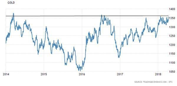 Now the $1,360 resistance level that has been an absolute brick wall since 2014 is looming once again, and gold-bugs are – once again – wondering where the next resistance lurks if this level is finally pierced.