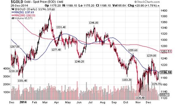 Well the good news is that Gold ending down on the year is improbable. The bad news is that neither does Gold look set to soar into the stratosphere, the best that the Gold price could muster during 2015 would be about a 10% gain and that's the best, therefore most probable is another year of stagnation i.e. we may see Gold end the year up between 5% and 10% so between $1,250 and $1,320.