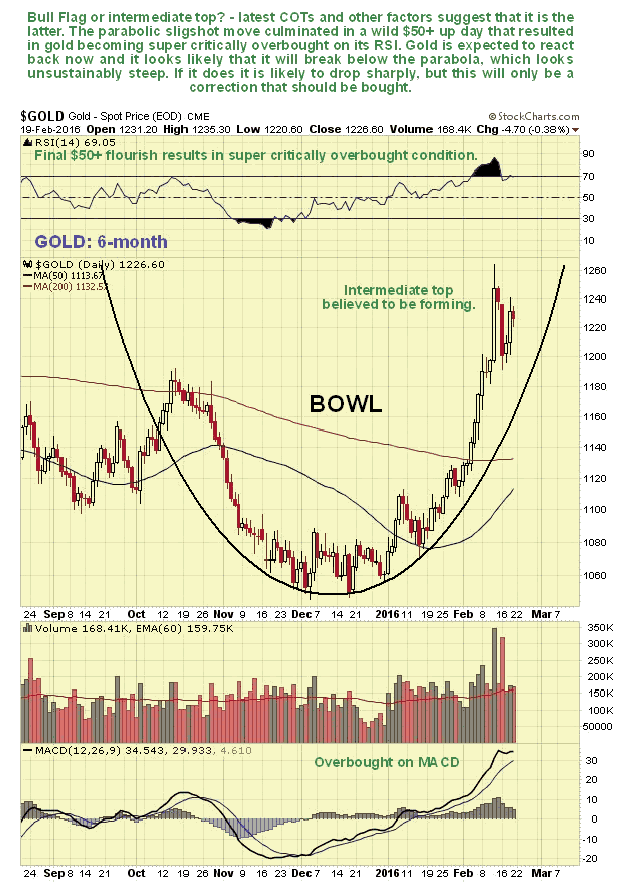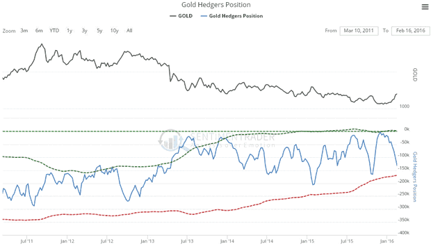 A correction in the Precious Metals is of course likely to coincide with a dollar rally. The dollar got slammed early in the month as we had expected on growing realization that the Fed's rate rise was a "mistake" that will eventually be reversed in preparation for NIRP, as we can see on its 6-month chart below. In reality the Fed's rate rise in December was a sop to the mugs who had believed their story about raising rates, so that they couldn't turn round later and say "You lied to us for 18 months saying you were going to raise rates and didn't." Right now the dollar could rally in sympathy with the stockmarket for a while. The latest Hedgers chart, shown below, is in middling ground and thus doesn't provide much guidance, but it has been edging towards a bullish condition for many months, and so there is certainly room for a rally here.
