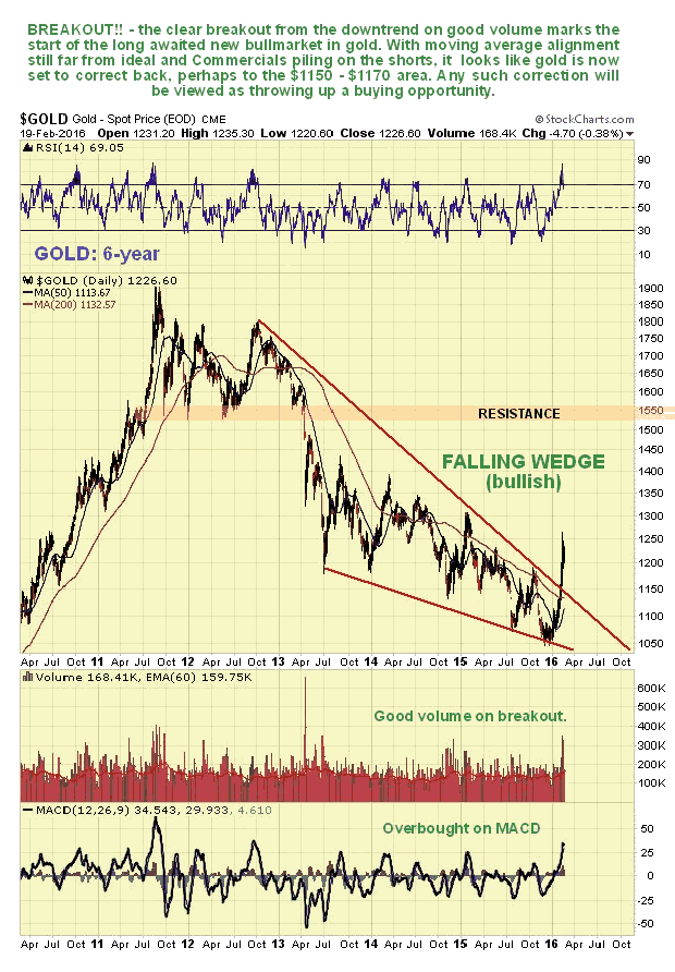 If you want fundamental reasons for a new bullmarket, you really don't have to look far. Try aggressive NIRP (Negative Interest Rate Policy) for starters. The big banks have plans to seriously mine their customer's accounts, and we are not talking about charging half a percent a year here, we are talking about 2 or 3 percent of your account money being siphoned off into their coffers every year for the privilege of you being able to hold an account with them. Of course, any rational person knowing this was coming would withdraw their money and stuff it under a mattress or buy gold, so they are going to be prevented from doing so, by the introduction of the "cashless society". The first steps towards this have just been announced with the proposed elimination of high value bills like the 500 euro note and $100 bill, ostensibly to impede the activities of criminals and money launderers, which is of course a smokescreen to hide their true intent. Now you can see why gold suddenly looks so attractive - which would you rather do? - be a sheep and hold your money in a bank account and be fleeced to the tune of 2 or 3% a year, or own gold, where at least you are aren't losing capital, apart from storage costs. It's a no-brainer and with the cashless society and extreme NIRP (bank plunder) now appearing over the horizon, you can readily understand why gold is coming to life. That won't stop a correction short-term however, especially if the investing public get suckered again by the latest stock rally.